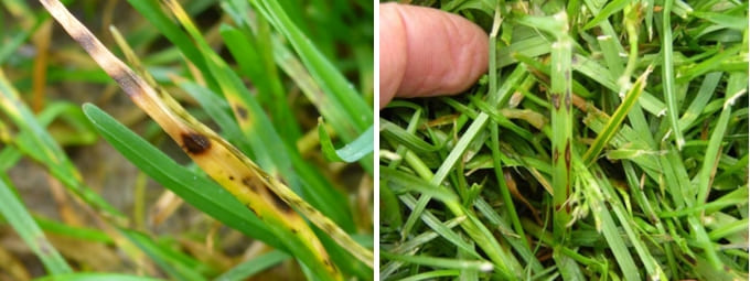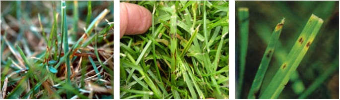 Проявляется в виде листовой пятнистости и разреживания травостоя. Вызывается возбудителями Drechslera poae и Bipolaris cynodontis, Bipolaris Sorokiniana (ранее наименование Helmintosporium). И если Bipolaris поражает многие виды трав, то Drechslera поражает исключительно мятлик. Но протекают они, как правило, вместе. Симптомы проявляются с мая по сентябрь, если в это время стоит теплая, влажная погода. Очевидное проявление когда температура начинает превышать 20°С, и с повышением температуры болезнь все более активизируется, наибольшая вредоносность при температурах выше 30°С и высокой влажности. В ранних стадиях проявляется сначала листовая пятнистость, в виде небольших точек на листьях коричневого, фиолетового или черного цвета, в дальнейшем пятно увеличивается, центр его приобретает желтую окраску с четко выраженной окантовкой коричневого или черного цветов. Вокруг окантовки может быть желтый ореол. По мере того как пятна расширяются, они начинают сливаться в единое целое, что приводит к отмиранию листа. Постепенно болезнь распространяется на все растение, вызывая его гибель, и как следствие разреживание травостоя. В тени, в условиях недостаточной освещенности, избыточной влажности и отсутствии проветривания может протекать особенно тяжело.
