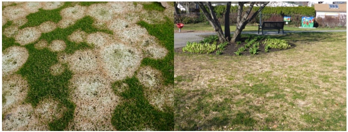 На правой фотографии уже активное развитие заболевания, так оно проходит в тех районах, где нет снега, зачастую там диаметр пятен не превышает 5 см. В регионах где снежный покров устойчивый более 60 дней пятно может разрастись до 30 см в диаметре. Очень часто пятна сливаются друг с другом, и создается картина сплошного поражения.